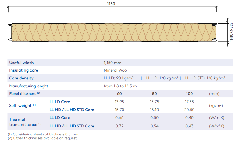 Highly customisable panel, with three types of core (LL LD, LL HD or LL HD STD), sheet thicknesses between 0.5 and 0.8 mm, various profiling options, etc.