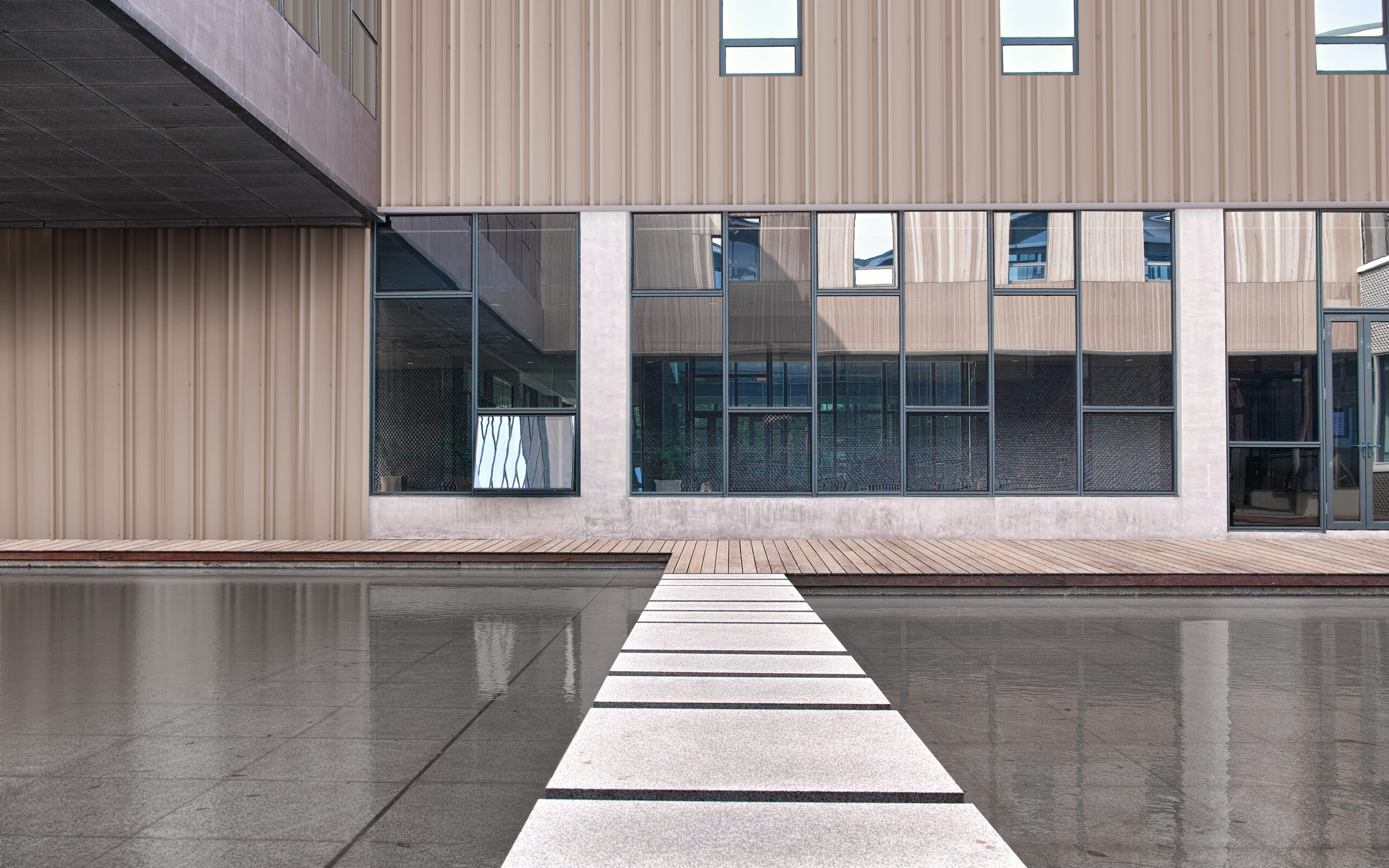 The public library is clad with MyWall Asteroid, an earth-toned metallic profile that conveys calm and blends in naturally with its surroundings.