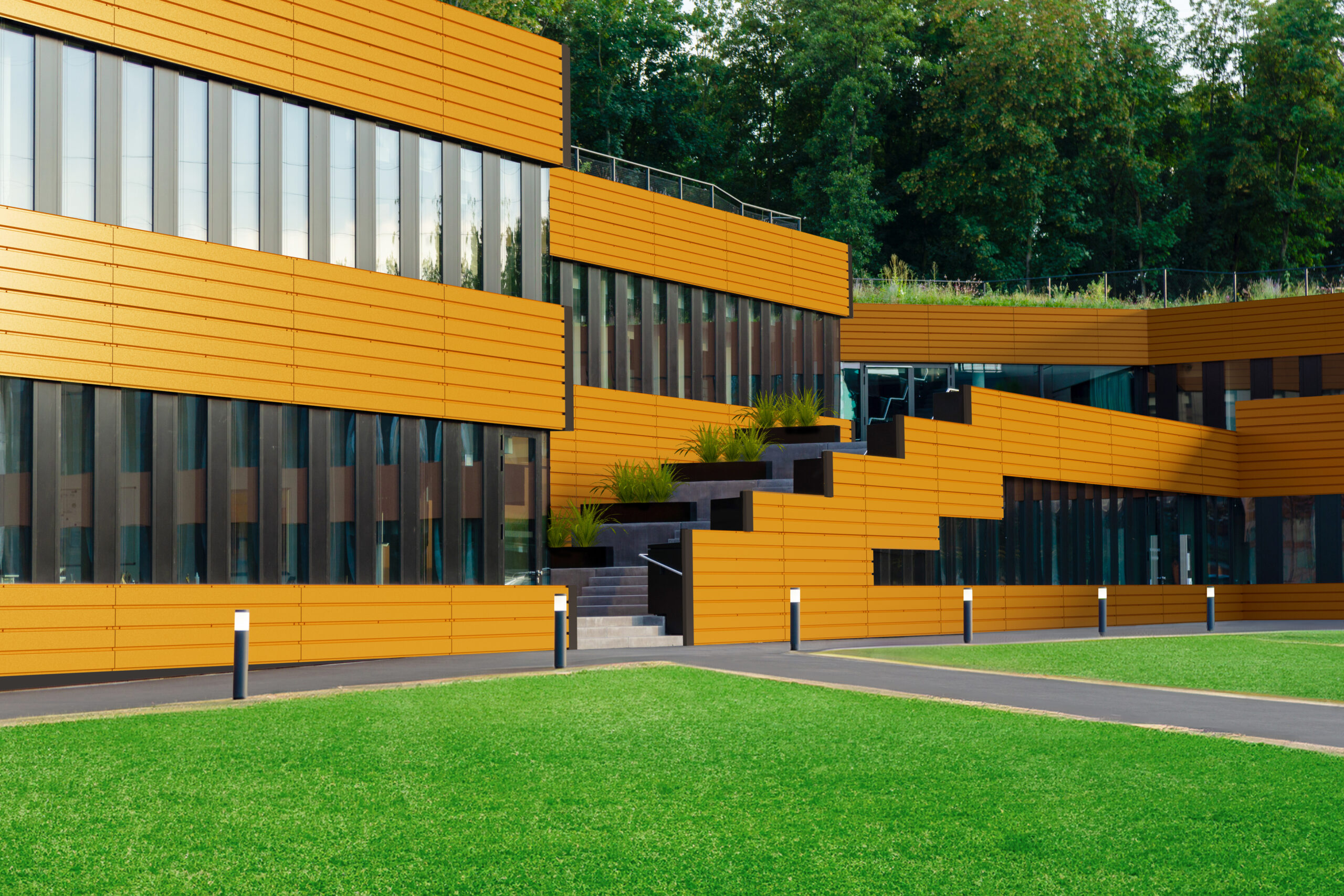 In a low-rise office building, MyWall Land emphasises horizontality with clean lines that align the glazed openings and bring an elegant depth to the façade.