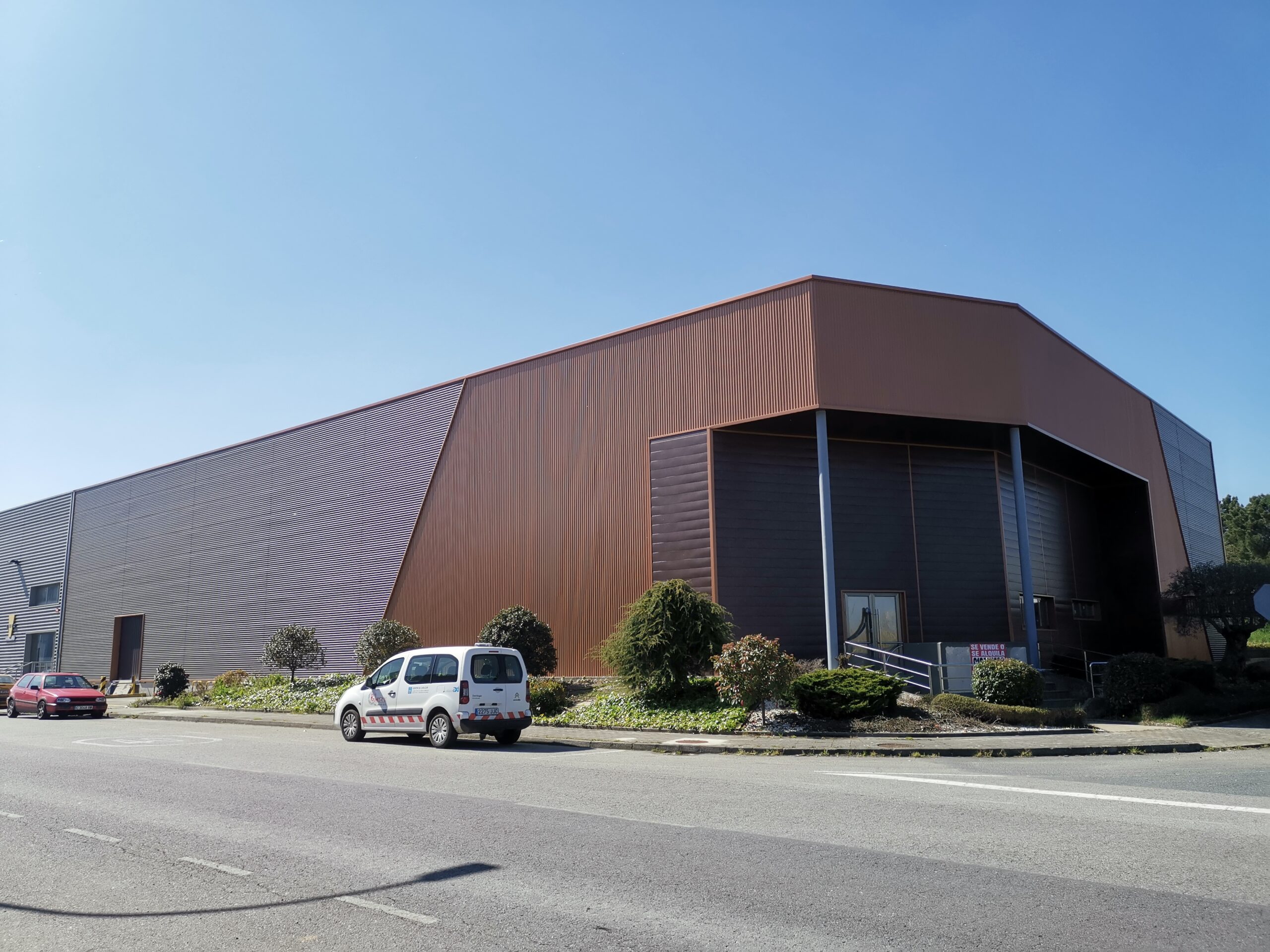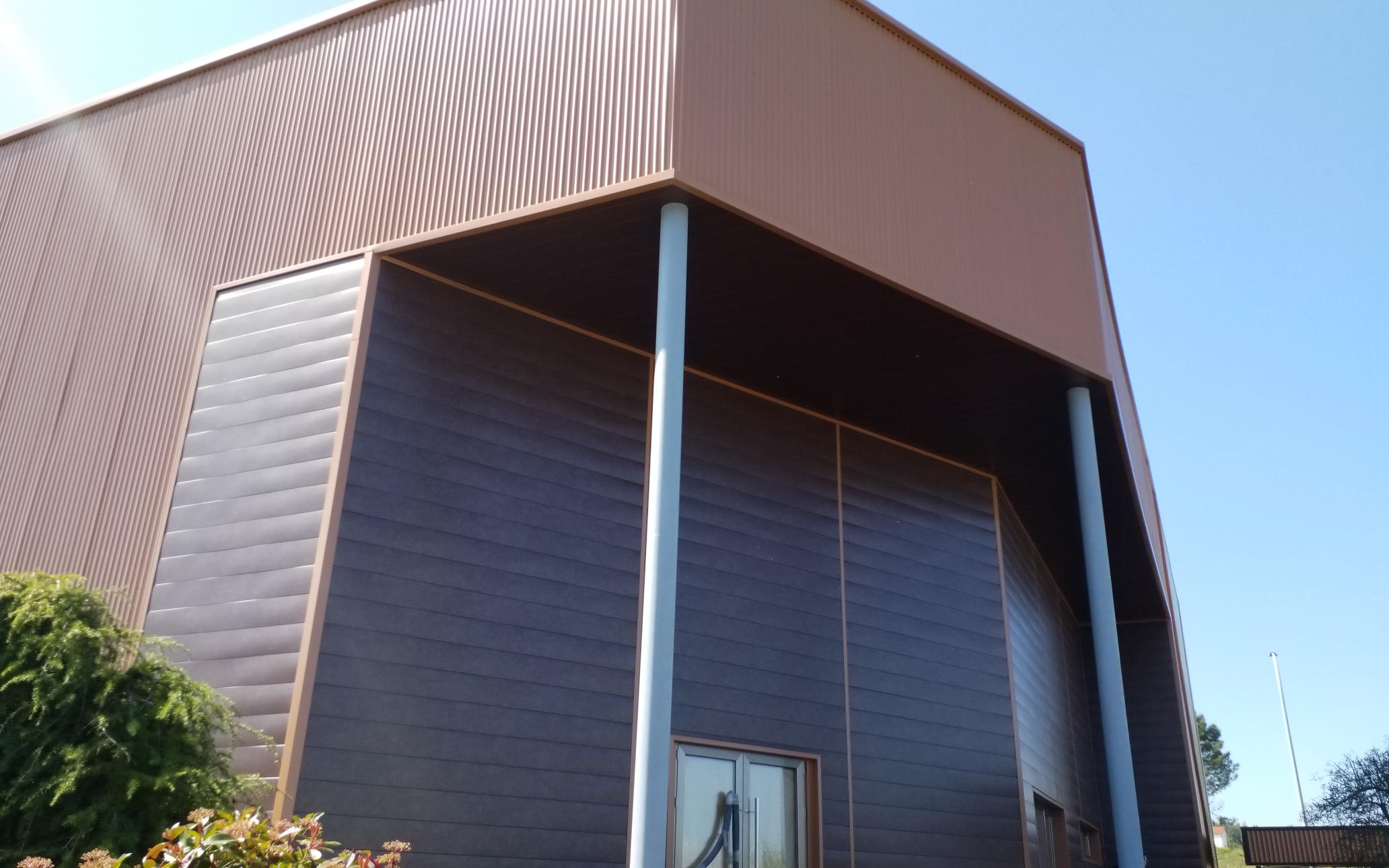 In the Betanzos industrial building, the main façade combines the IBEO-250 system in Corten effect with the TZ-16 metal cladding in copper tone, creating an elegant and modern image.
