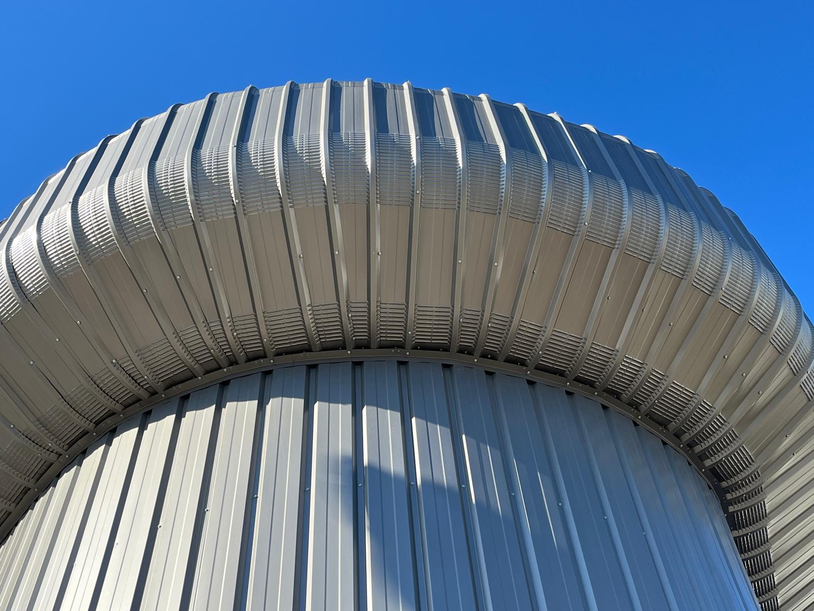 The curved metal cladding connects the vertical façade with the curved top finish, offering continuity even at the triangular meeting point between the two main façades. Curved metal enclosures are a strong and customised solution for each project.
