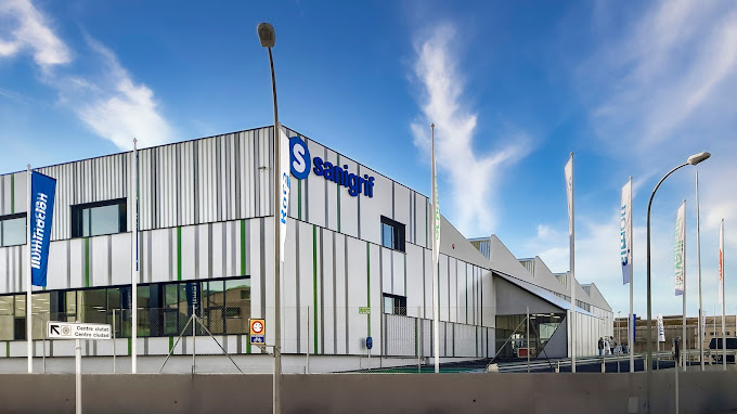 The industrial building has a dynamic façade with the IBEO-250 system installed horizontally, combining white with touches of corporate colours. The layout between ground floor and first floor creates a differentiating and modern visual effect.