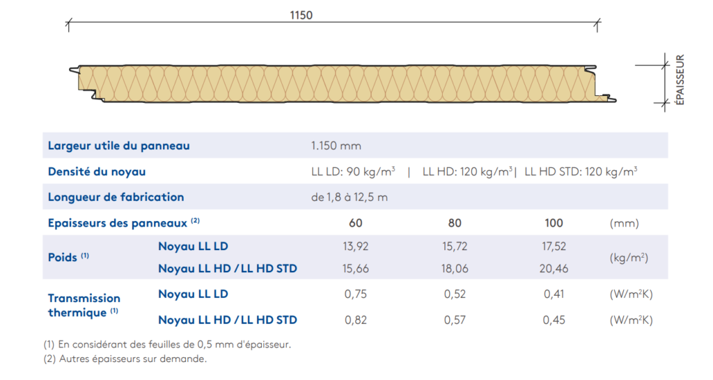 Panneau sandwich isolant pour façades avec âme en laine de roche et faces métalliques.